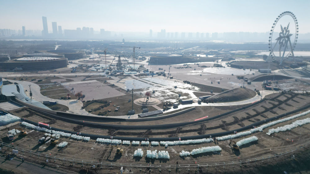 12月12日拍摄的建设中的第二十七届哈尔滨冰雪大世界(无人机照片)。新华社发(刘洋摄)