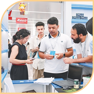 在义乌全球数贸中心,外国客商与经营户洽谈采购事宜。王怿杰摄
