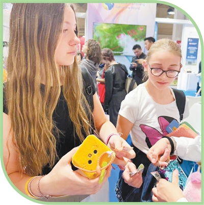 2025年意大利都灵国际书展上,外国青少年对“立方小伴”毛绒玩具爱不释手。魏华良摄