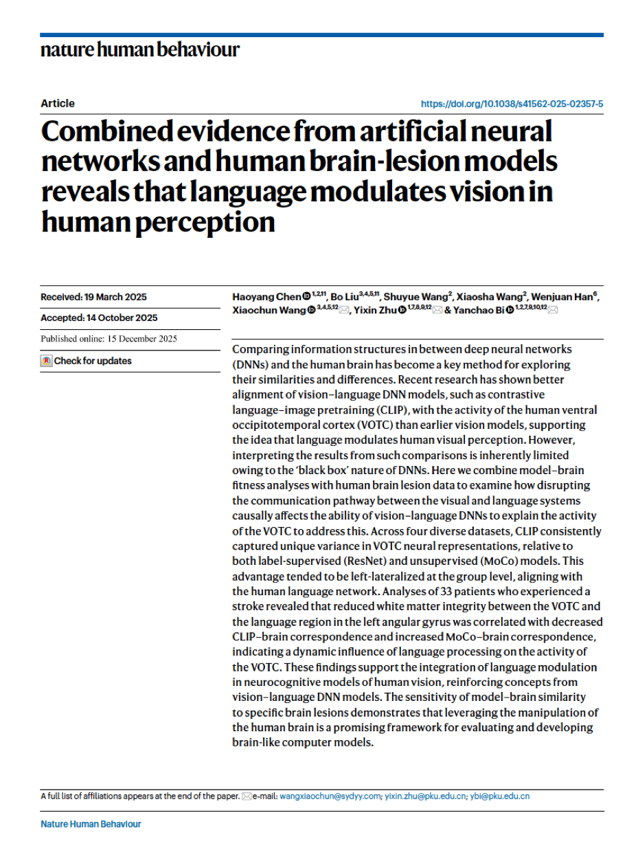 当我们看到“玫瑰”时,大脑只是单纯地在“看”吗?近日,北京大学联合北京师范大学、山西医科大学第一医院的研究团队发现,语言不仅塑造我们的思维,也可能在潜移默化中改变我们“看世界”的方式。这项成果以《结合人工神经网络与人类脑损伤模型证据揭示语言调节人类视觉感知》为题,发表于国际顶级期刊《自然·人类行为》(Nature Human Behaviour)。研究结合了人工智能模型与健康人群和脑卒中患者的脑影像数据,为“语言是否影响感知”这一百年未解的心理学核心问题提供了新的证据,也展示了人工智能与脑科学相互启发的研究范式。