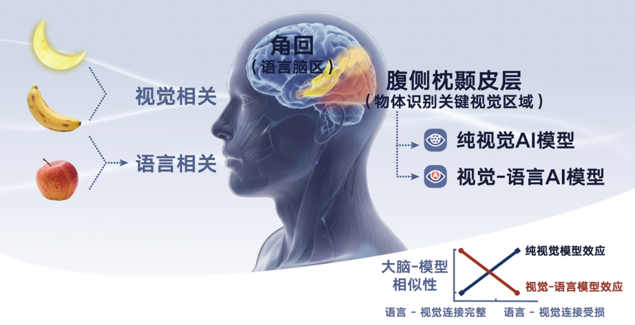 然而,AI模型与人脑的相似性,并不能直接证明语言在其中起了因果作用。为此,团队将目光转向了一个特殊群体——脑卒中患者。脑卒中常会损伤连接语言区与视觉区的白质纤维通路,为科学家提供了一个“天然对照实验”。研究结果表明:患者语言—视觉通路受损越严重,其视觉脑区活动越像“纯视觉模型”,而越不像“视觉—语言模型”。当语言—视觉通路被破坏,语言对视觉的调节作用随之消失,成为“语言调节视觉”的直接证据。这一现象提示语言与视觉之间的功能联系具有方向性,而非仅仅反映共激活。论文共同第一作者刘擘表示:“脑损伤患者的数据是无价的——他们让我们看到了人脑中语言通过与视觉皮层连接的神经通路调控视觉功能的必要性。”