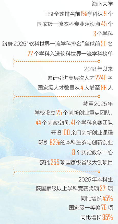 如今,海南大学ESI全球排名前1%学科达9个,国家级一流本科专业建设点45个,3个学科跻身2025“软科世界一流学科排名”全球前50名,22个学科入选软科世界一流学科榜单,为自贸港高质量发展筑牢全方位学科支撑。