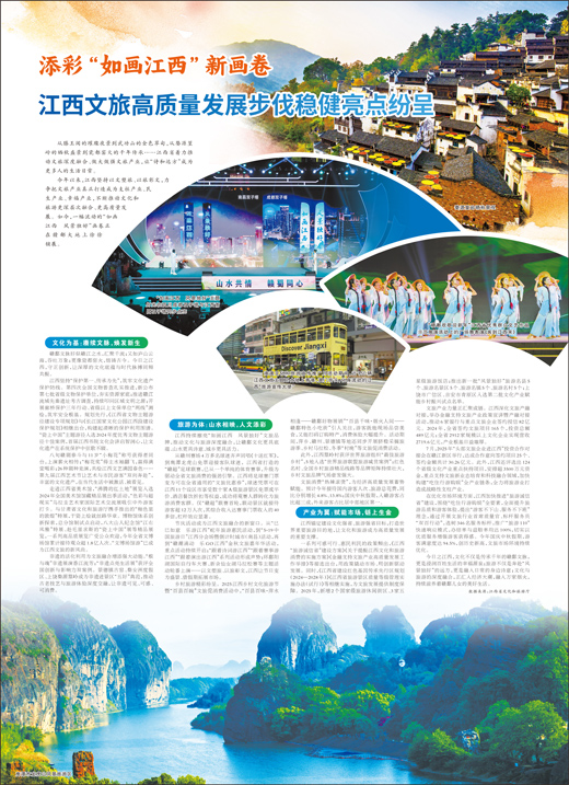 今日之江西,文化不仅是传承千年的赣鄱文脉,更是浸润百姓生活的幸福源泉;旅游不仅是奔赴“风景独好”的远方,更是融入日常的身边诗意;文化与旅游的深度融合,正汇入经济大潮,融入万家烟火,持续滋养着赣鄱儿女的美好生活。