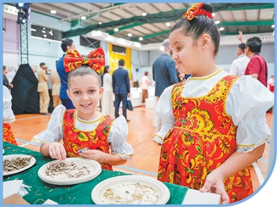迪拜中国学校是中国政府在海外开办的第一所中国学制全日制学校。中建中东公司积极参与学校的筹备建设和运营工作。图为今年8月,在迪拜中国学校开学典礼上,两名当地小学生正在体验中国文化。 |