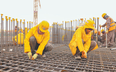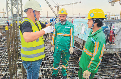“鲁班工匠计划”是中国建筑推出的一项属地员工培训计划。中建中东公司在承接各项工程时,通过师带徒和现场教学方式,开展技能实操、安全生产、理论知识等各项培训。图为中方员工(左一)在施工现场进行教学。 |