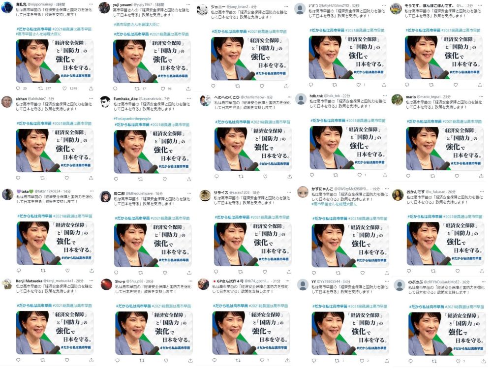 日本社交媒体平台充斥如“当然只能支持高市早苗”“高市早苗拜托了”等内容相似的帖文。