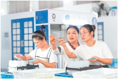 李洪梅(中)在指导员工加工手机膜。陈 杰摄
