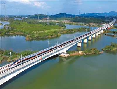 图为22日,从湛江北站开往广州白云站的列车驶过丰头河特大桥。 |