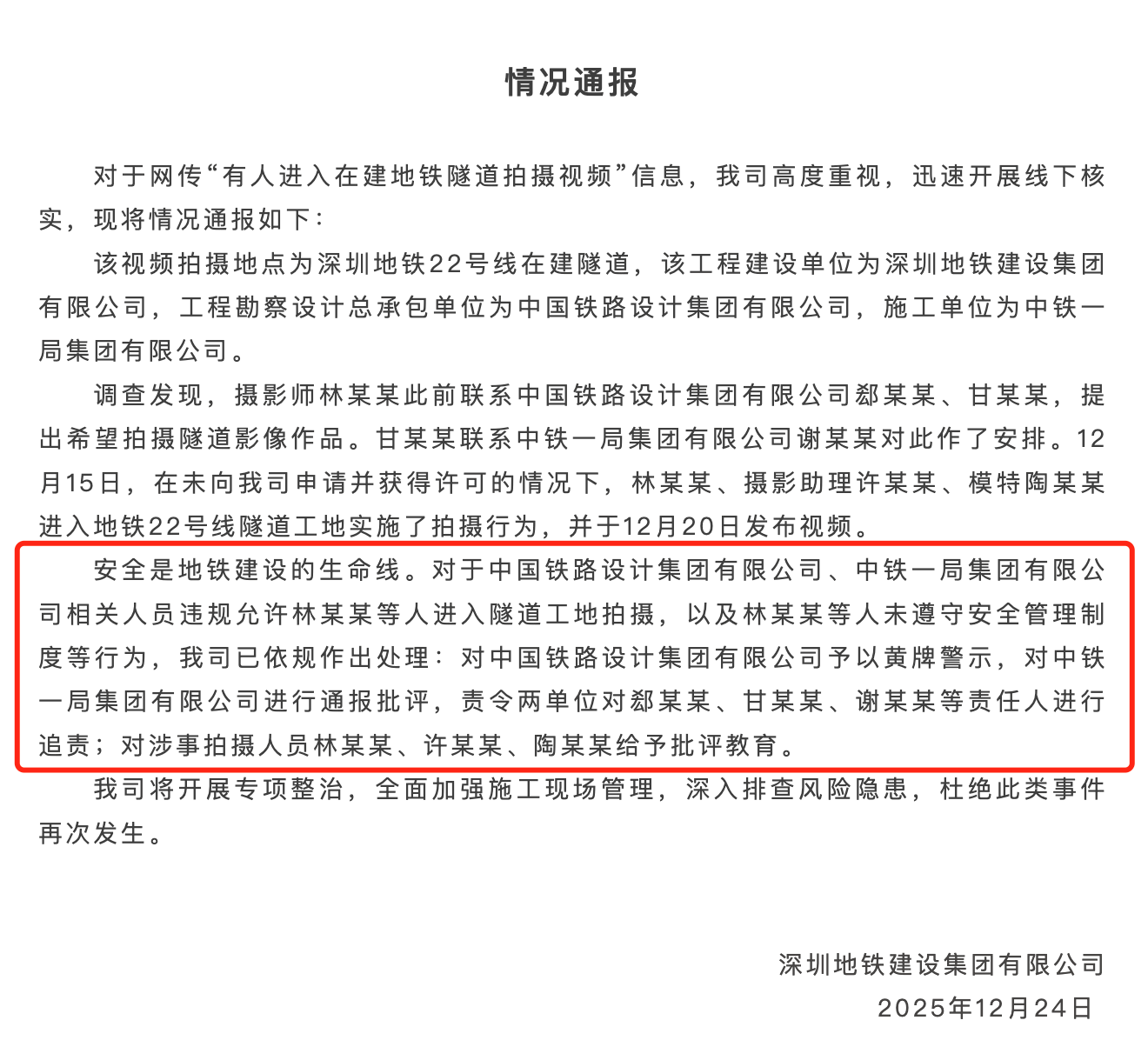 12月24日,深铁建设集团发布情况通报称,12月15日,在未向我司申请并获得许可的情况下,林某某、摄影助理许某某、模特陶某某进入地铁22号线隧道工地实施了拍摄行为,并于12月20日发布视频。