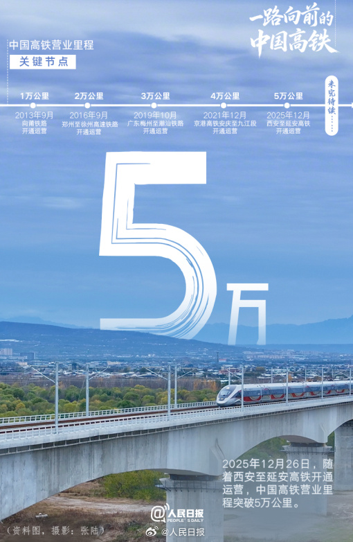 记者从中国国家铁路集团有限公司获悉,26日,随着杭州至衢州高铁、沪渝蓉沿江高铁武汉至宜昌段、西安至延安高铁先后开通运营,中国高铁营业里程突破5万公里,营业里程位居世界第1位,超过世界上其他国家高铁营业里程的总和。