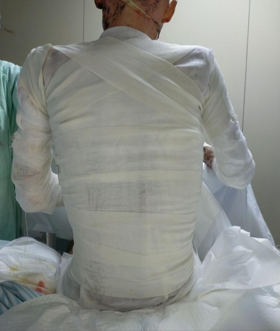 “转诊至重庆市中医院时,小张的病情已危重到极致——全身69%的表皮脱落,体表覆盖着黑痂,多处创面伴随渗血、渗液,还合并了多种病原菌感染,皮肤屏障的严重破坏导致其免疫防御功能近乎崩溃,多个脏器功能也受到不同程度损伤,面容在纱布覆盖下几乎难以辨认。”急诊ICU参与救治的主治医师张瑾回忆道。