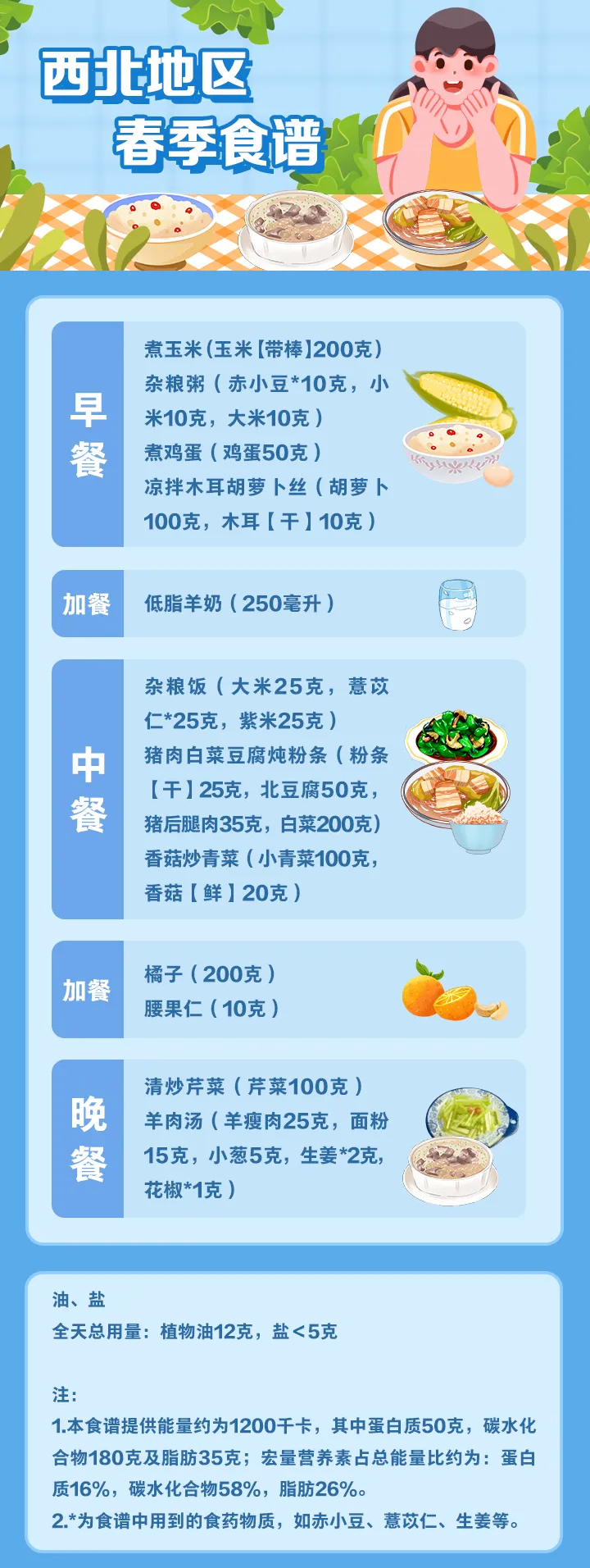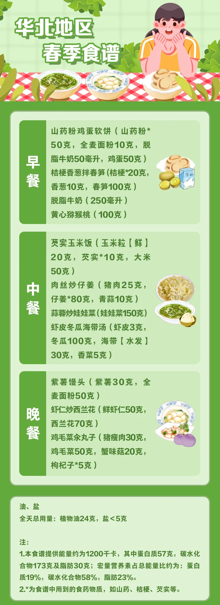值得注意的是,这份指南还包含了全国不同地区的全天食谱示例,并备注了食谱的“总能量”。不同地区的使用者可参照食养原则和建议,结合食物交换表,根据具体情况进行合理搭配。以春季食谱为例: