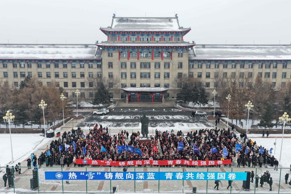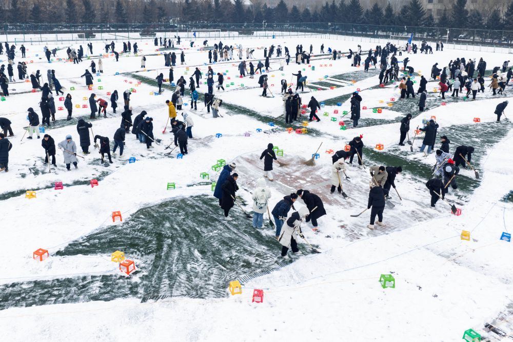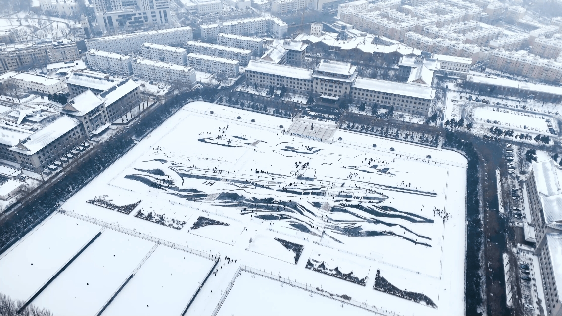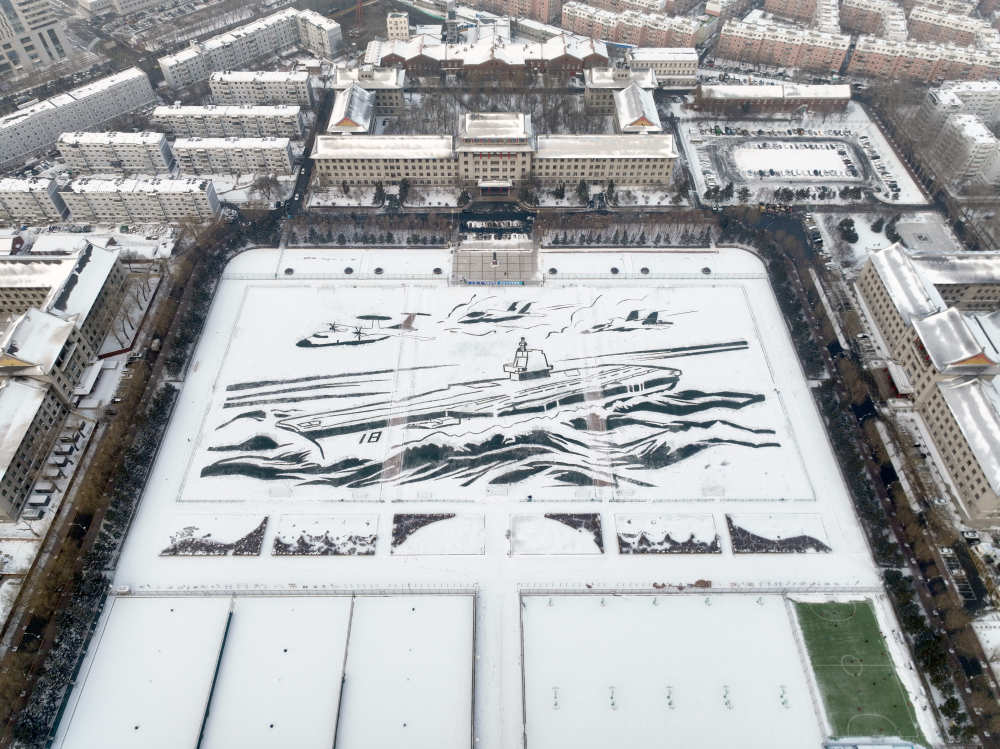 在230米长、112米宽的军工操场上,一艘威武的“福建舰”航母破雪而行……12月28日上午,哈尔滨工程大学1200余名师生以雪为卷、以锹为笔,冒着零下十几摄氏度的低温,绘制了大国重器的雄姿,更通过北斗卫星定位等专业技术,实现了一场冰雪艺术与硬核科技的碰撞。