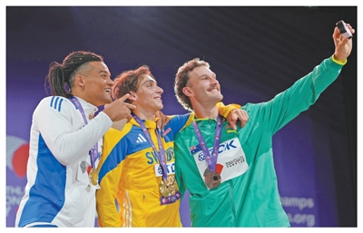 运动员在东京田径世锦赛上合影。新华社记者 江汉摄