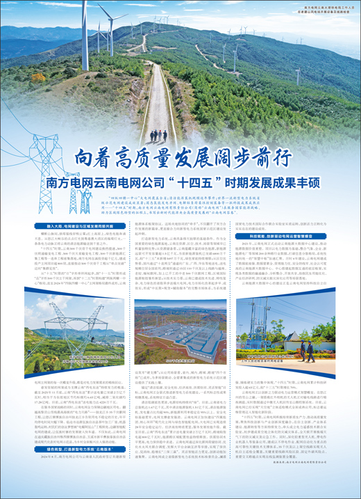 “十四五”时期,云南电网积极培育新质生产力、推动高质量发展,聚焦科技创新与产业创新深度融合,在自主创新、产业体系建设、能源转型等方面持续发力,牵头成立电力遥感技术联合实验室,初步建成星空地立体化防灾减灾体系,全天候开展极端天气下的防灾减灾及应急工作。同时,深化轻重型无人机、带电作业机器人等装备应用,建成以不停电作业、配网自动化为重点的高可靠性关键技术支撑体系,35千伏及以上架空线路实现无人机自主巡检全覆盖,关键重要线路风险区段、固定外破风险点、重要交叉跨越点实现在线监测装置全覆盖。