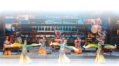 台上,古编钟、编磬、鼓、箎、笙、琴、瑟、排箫等多种传统乐器,与现代乐器、灯光舞美结合,配合长袖翩翩的舞蹈,仿佛瞬间将观众带入一个贯通古今的声场。