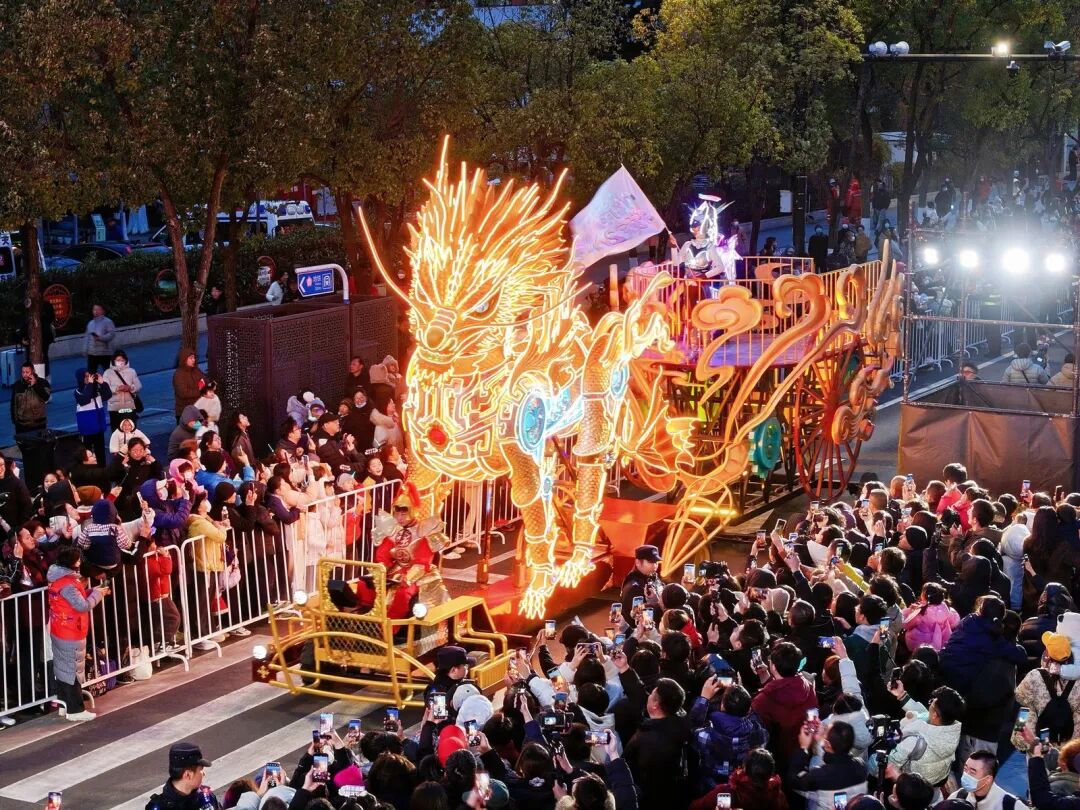 “快看!有那么多舞狮!”随着国潮醒狮的腾跃起舞,跨年活动在江北新区凤凰大街拉开帷幕。灵动的鱼灯沿着凤凰大道次第巡游,灯笼光影摇曳生姿;酷炫的赛博麒麟踏着动感节拍登场,传统韵味与未来科技感碰撞出别样火花,引得现场观众纷纷举起手机拍照记录。
