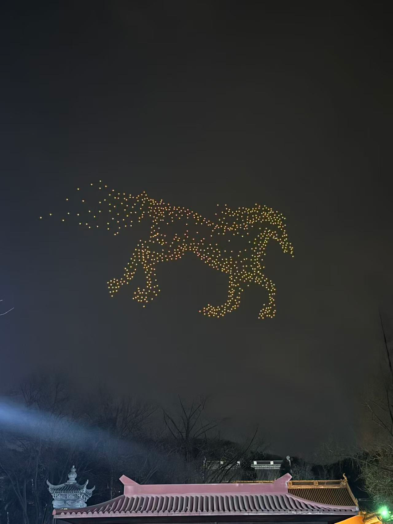在栖霞古寺,除了传统的撞钟祈福仪式,1000架次无人机翩然升起,以栖霞古寺与深邃天穹为背景,展开了一场精彩表演,最终,“新年快乐”的祝福字样定格夜空。