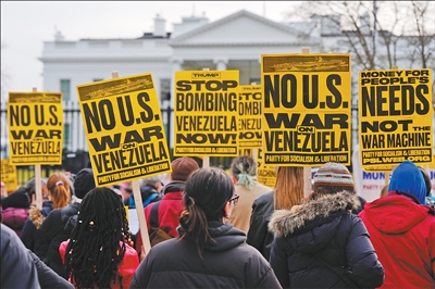 1月3日,一些美国民众聚集在白宫外,抗议美国对委内瑞拉发起大规模军事行动。 |