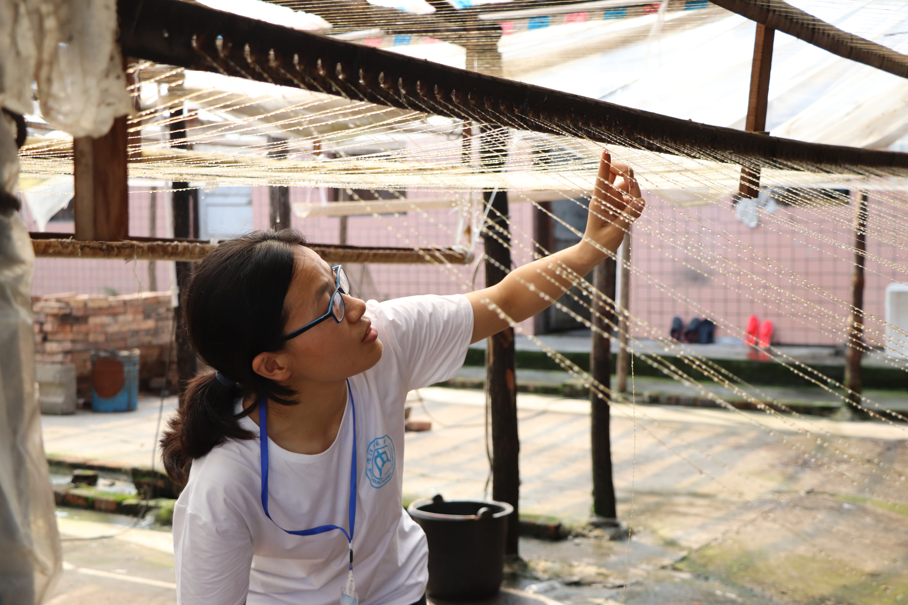 非遗传承人张芳书记在进行经线上浆检查