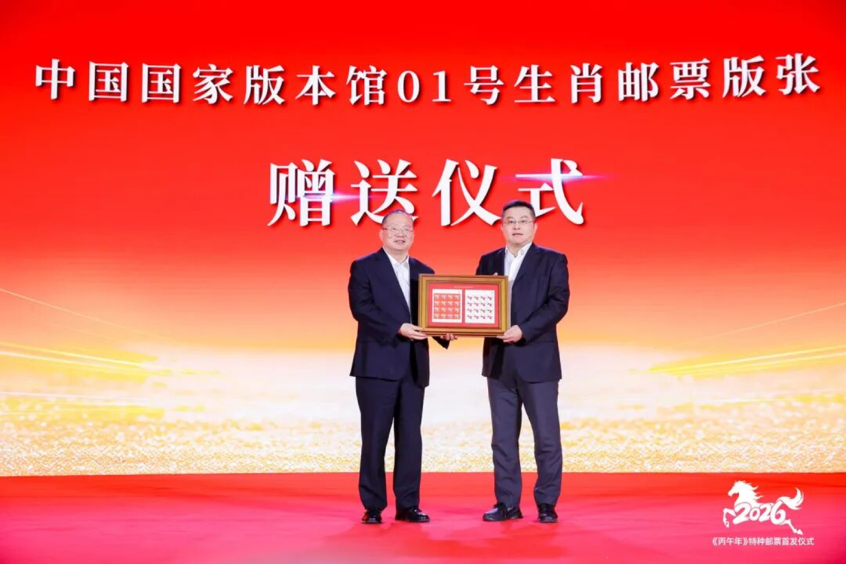 中国邮政集团有限公司党组副书记、总经理郑国雨将编号为01的《丙午年》特种邮票版张赠予中国国家版本馆作为永久馆藏版本。