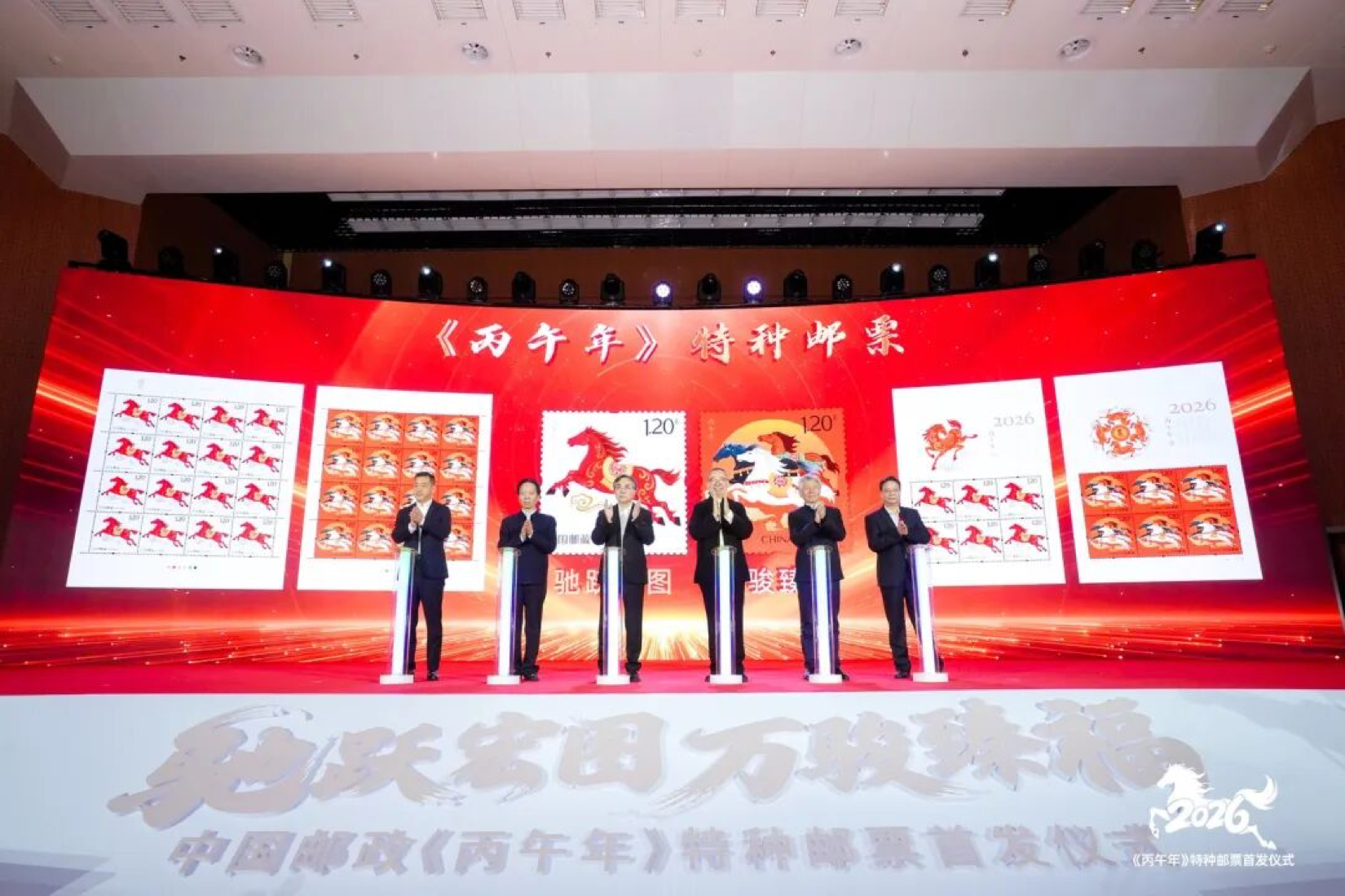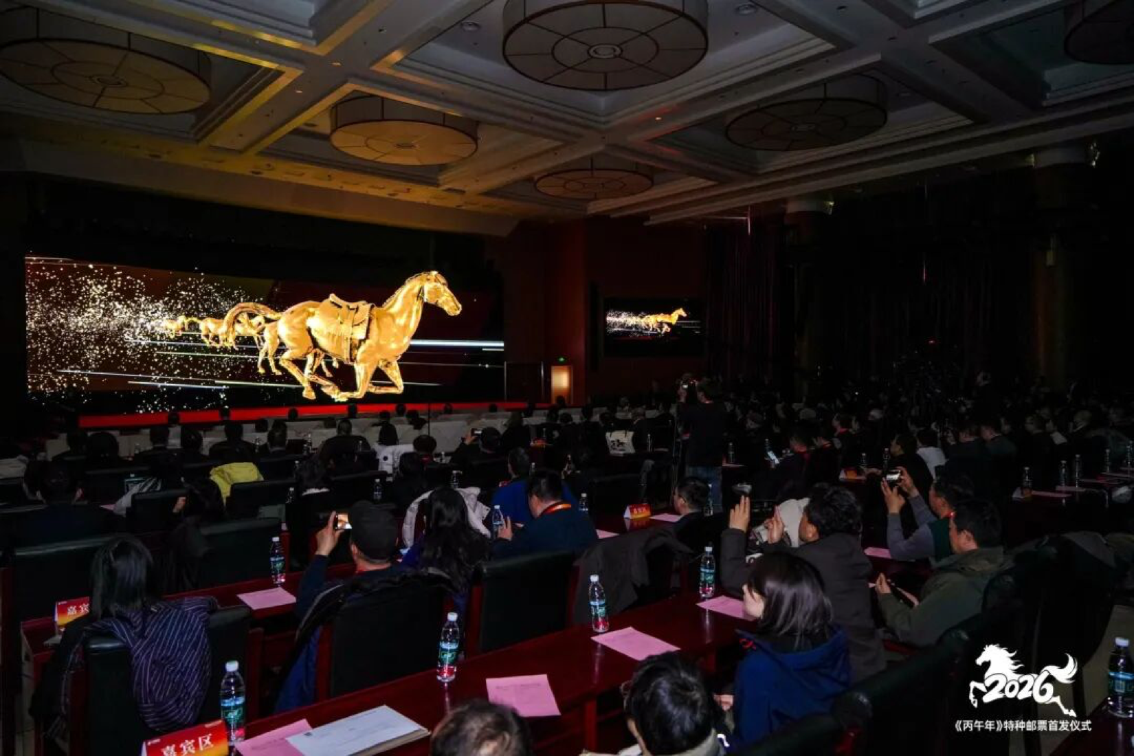 2026年1月5日上午10时,人民日报社新媒体大厦配楼报告厅内,全场暗灯,舞台大屏中央,激光雕刻出“中国邮政”几个大字。紧接着,一匹骏马跃然“屏”上,奔腾而出,绕场一周。此刻,舞台灯光亮起,《丙午年》特种邮票首发仪式正式开启。