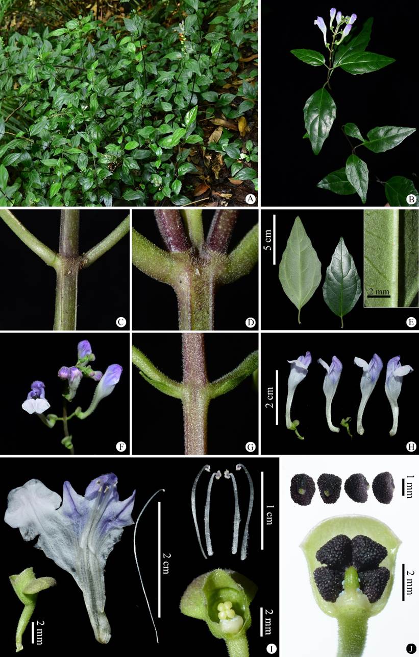 然后,我们将蓝花黄芩与产我国以及东南亚的所有种类进行了对比,发现它与爪哇黄芩完全不同,但与一个更早发表的种十分相似,即由英国植物学家Hemsley于1890年发表的狭管黄芩(Scutellaria stenosiphon Hemsley)(图4)。同样地,狭管黄芩也是根据栽培标本描述的,它最初由C. Ford于1884年采自广东罗浮山山区,并栽培于香港植物园。后来的学者均承认狭管黄芩是一个独立的物种,但是在此后的140多年里再也没有采到这个种的标本。在朋友马政旭等人的帮助下,我们获得了蓝花黄芩和狭管黄芩这两个种的模式标本以及局部的高清照片。最后,经过仔细对比,我们认为蓝花黄芩与狭管黄芩实际上为同种,由于后者发表年份较早而具有优先权,因此将蓝花黄芩并入狭管黄芩。研究还发现狭管黄芩仅分布于我国福建、广东、江西和香港,海南和云南不产。