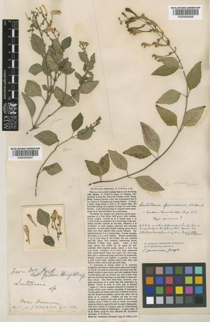 1894年,Veitch & Sons公司苗圃里正在开花的一种黄芩属植物被英国植物学家N. E. Brown描述为新种蓝花黄芩(Scutellaria formosana Brown)(图1)。它的茎无毛,叶卵形,先端近钝形,基部宽楔形,叶缘具不明显的齿,两面无毛,花梗和花萼被极细的微柔毛,花冠白色,筒部略带淡绿色,上唇蓝色带紫罗兰色,下唇白色。他认为蓝花黄芩与广泛分布于东南亚的爪哇黄芩(S. javanica Junghuhn)(图2)近缘,并可能是后者的一个变型,但在植株大小、茎和叶的毛被、叶形及花的大小和颜色等方面有显著区别。