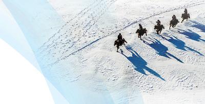 “海东青”骑警队骑警在内蒙古呼伦贝尔市陈巴尔虎旗的雪原上巡逻。