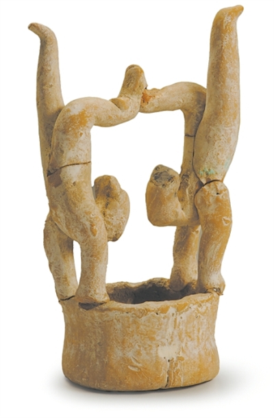 杂技俑(汉) 陕西省考古研究院藏 2007年出土于陕西省西安市临潼区岩上村。为双人杂技俑,通体施白色彩绘,发髻饰黑色彩绘。两人均双手对称握缸沿倒立,右脚底相接,左脚伸直,头向上扬起。姿态生动,是研究汉代体育和表演艺术的重要实物。 |
