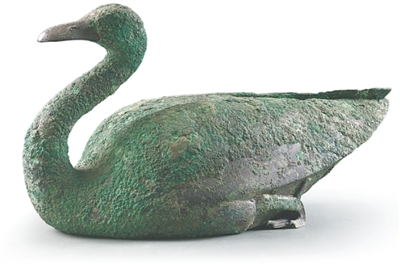 铜雁(秦) 陕西省考古研究院藏 2001年至2003年出土于陕西省西安市临潼区秦始皇陵园。铜雁颈部呈S形,腿及爪趾紧收于腹下,前爪向前平伸,呈平卧姿态,双翅收于尾后,静中有动,栩栩如生。 |