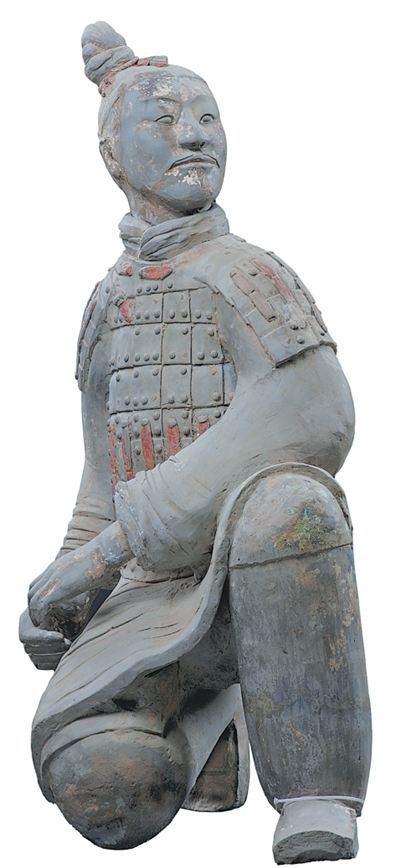 跪射武士俑(秦) 秦始皇帝陵博物院藏 1977年出土于陕西省西安市临潼区秦俑二号坑。武士单膝跪地,身体侧转,双手于腹前作握弓状,发髻、衣甲、鞋履刻画精细,体现秦兵马俑强烈的写实风格。 |