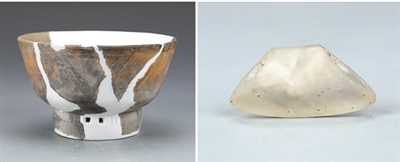 江苏溧阳鲍家遗址出土的施黑色彩绘陶碗(左图)和玉璜形饰。图片均为胡颖芳提供