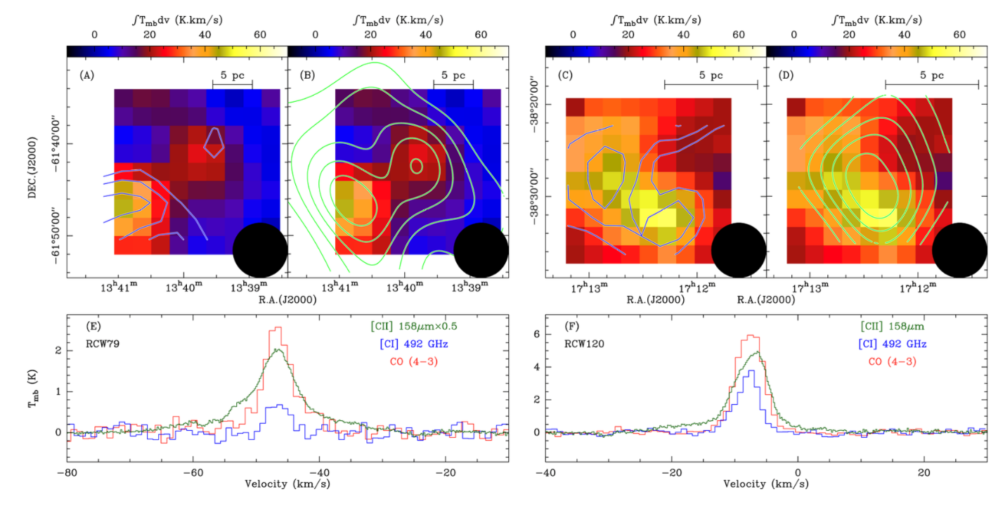 RCW 79和RCW 120中C⁺、C⁰与CO的空间分布及光谱特征。
