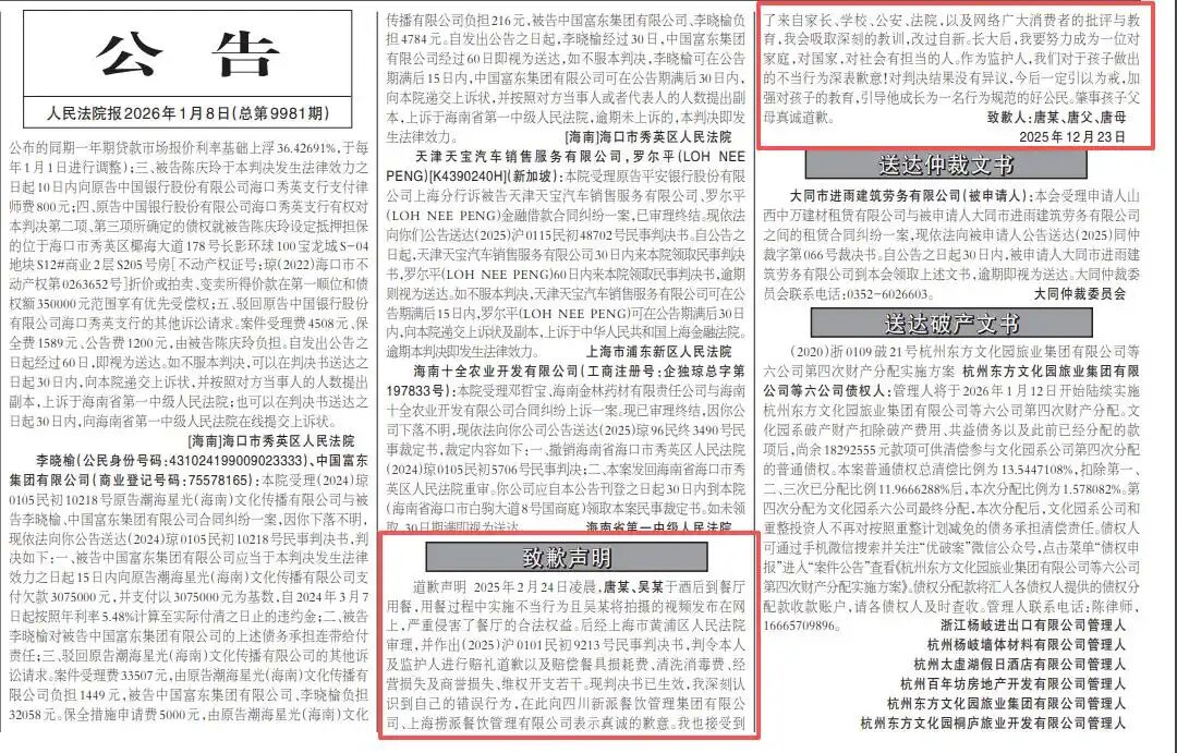 2026年1月8日,《人民法院报》3版刊登了海底捞小便当事人唐某及其父母的道歉声明。 人民法院报电子版截