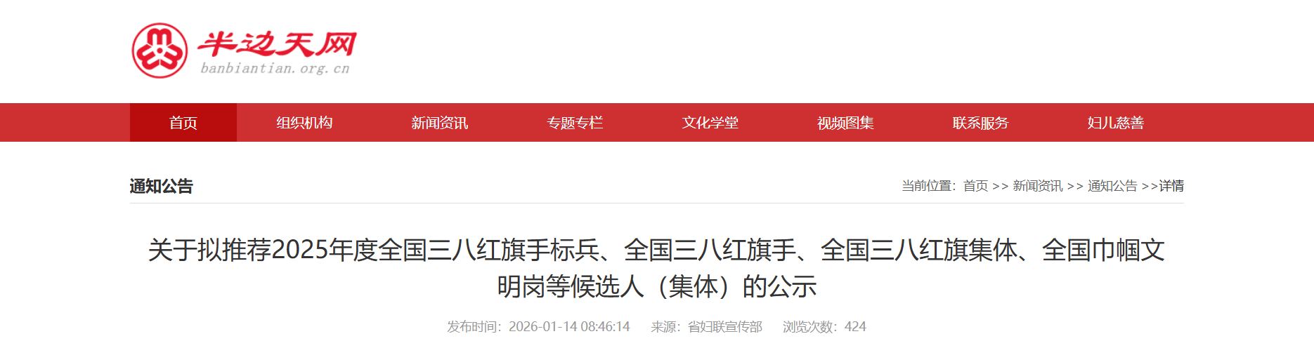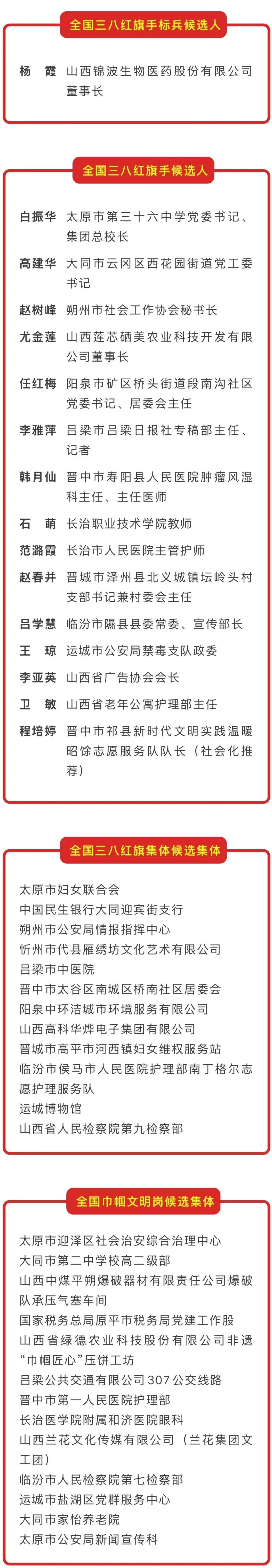 山西省妇联宣传部根据《全国妇联办公厅关于开展2025年度全国三八红旗手标兵、全国三八红旗手、全国三八红旗集体、全国巾帼文明岗评选活动的通知》(妇厅字〔2025〕34号),按有关程序组织开展了评审推荐工作,拟推荐杨霞为全国三八红旗手标兵候选人,白振华等15人为全国三八红旗手候选人,太原市妇女联合会等12个集体为全国三八红旗集体候选集体,太原市迎泽区社会治安综合治理中心等13个集体为全国巾帼文明岗候选集体,公示时间为1月14日至1月21日。