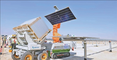 近日,在中国电建承建的阿联酋阿布扎比PV3阿吉班1.5吉瓦光伏项目大规模组件安装现场,国产光伏组件安装机器人首次在中东地区参与施工,助力新能源工程向高效率、高安全性和高智能化方向发展。图为机器人在安装光伏板。