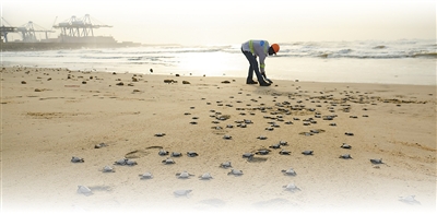 海龟保育专家在加纳特马新集装箱码头附近海滩放生海龟。 |