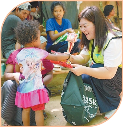 中建马来西亚公司员工在“点亮山区”志愿活动中向原住居民捐赠物资。 |