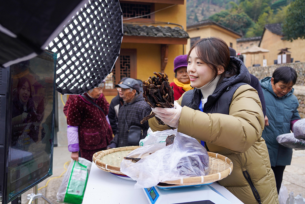 1月21日,村民和白鹤尖共富工坊直播团队成员介绍自己的特色农产品。章勇涛摄