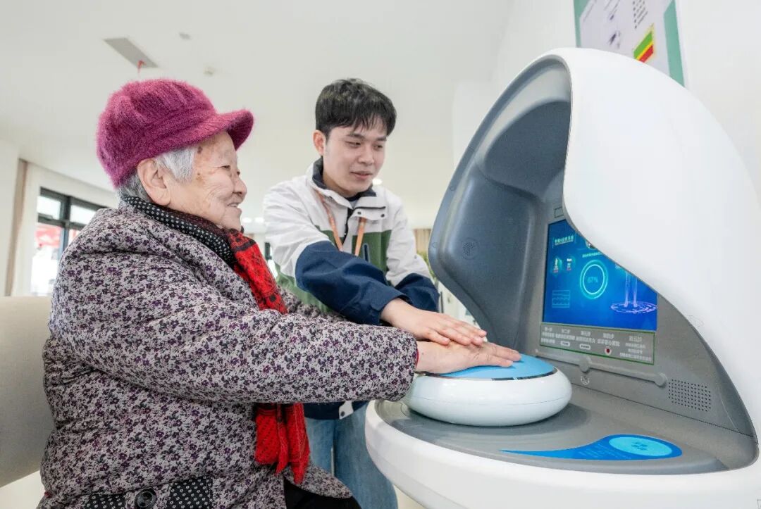 浙江省湖州市长兴县城投银杏苑健康生活社区,老人在护理人员的陪同下利用健康筛查机器人进行健康监测。谭云俸摄