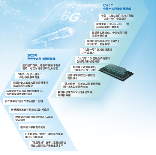 2025年中国十大科技进展新闻分别是:中国“人造太阳”EAST创造“亿度千秒”世界纪录;深度求索(DeepSeek)公司另辟蹊径推出中国AI;钍基熔盐堆建成,中国核能科技实现全新突破;中国肝癌预测系统登《自然》杂志封面,服务全球;“北脑一号”完成首批无线人体全植入;“从0到1”发现帕金森病原始创新靶点和候选新药;超导量子计算原型机“祖冲之三号”问世;我国科学家成功开发新型制氢技术;“黑土粮仓”科技会战黑土地全域保护技术取得重大突破;我国科学家在6G无线通信领域取得新突破。