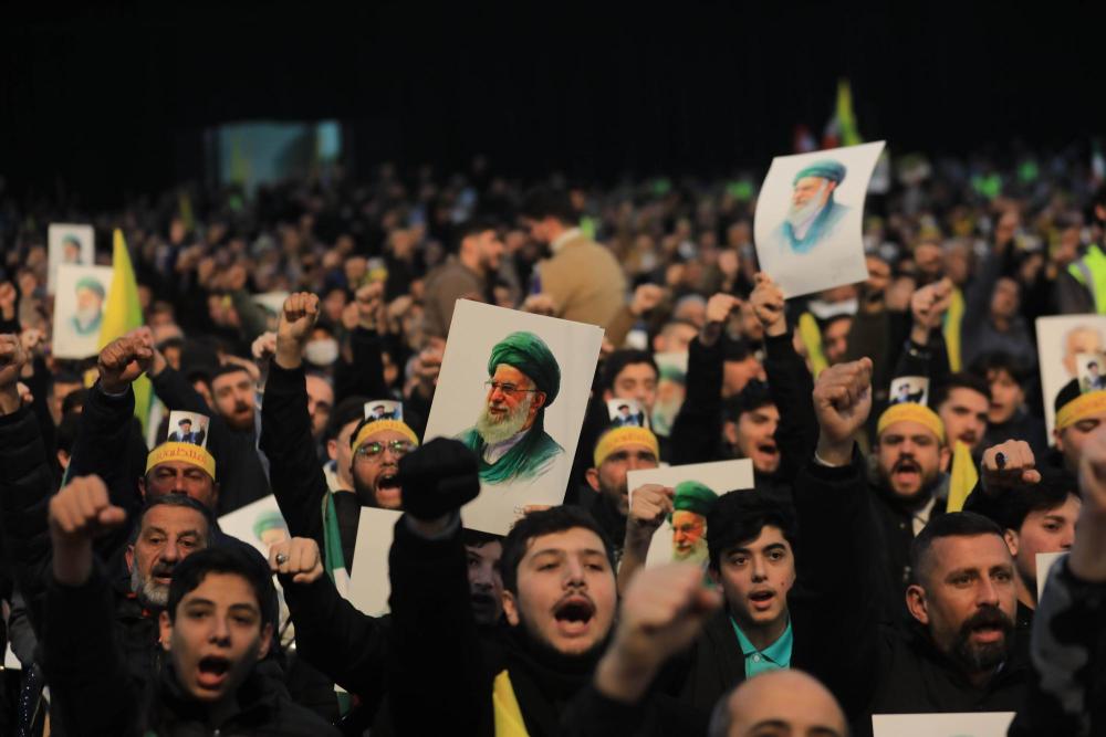 1月26日,在黎巴嫩首都贝鲁特,真主党支持者在集会中高举伊朗最高领袖哈梅内伊的画像,表达对伊朗的支持,并谴责美国的威胁。新华社发(比拉尔·贾维希摄)