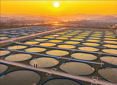 近年来,湖北省宜昌市因地制宜发展设施渔业,开展鲟鱼规模化养殖,助力乡村全面振兴。眼下,宜昌市宜都市高坝洲镇的“清江鲟鱼谷”320亩标准化鱼池已投产,投放鲟鱼母鱼800余吨。为保障鱼池的智能水循环设备正常运行,国网宜都市供电公司加强设备巡检,支持产业发展。图为工作人员在巡检鱼池。