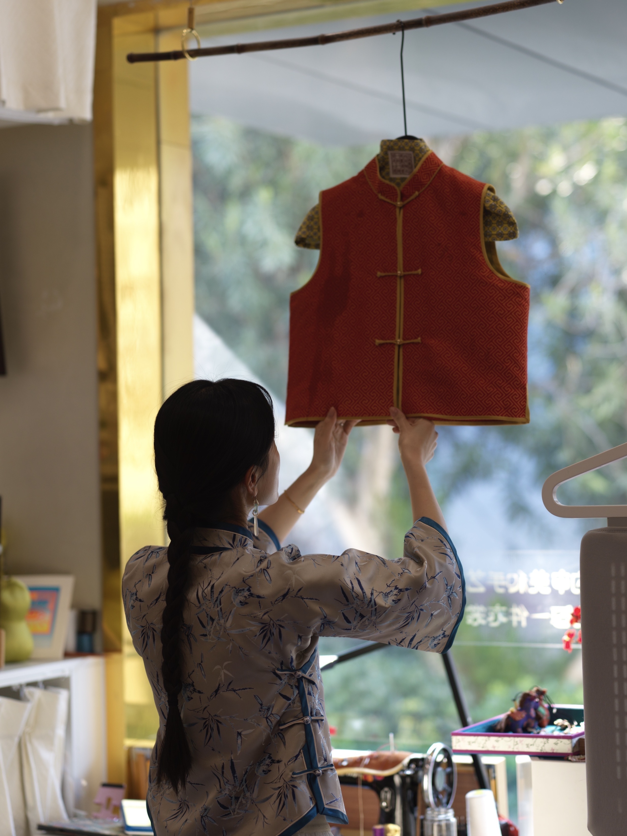 一次偶然的机会,她看到施意设计的一款融合现代元素的新中式丝绸马甲,其独特的设计感瞬间打动了她。很快,她就成了大施裁缝铺的忠实粉丝,每每有新品推出,她都会第一时间关注,遇到喜欢的就会买下来。“完全颠覆了过去的想象,既有传统底蕴,也非常时尚。”陈思伊说。