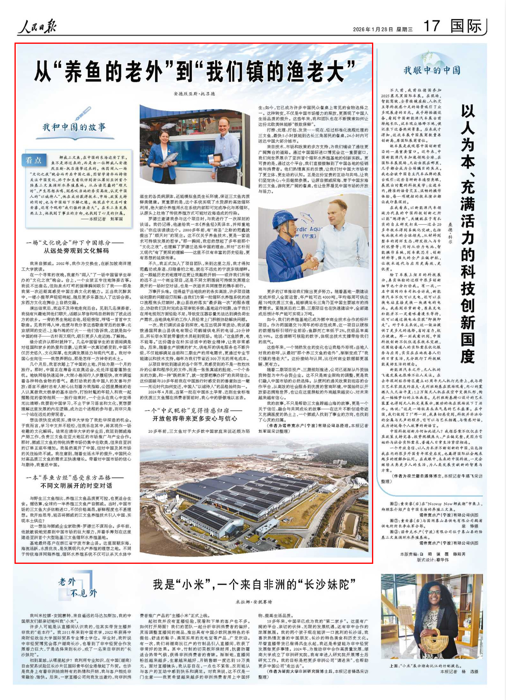 1月28日,《人民日报》17版采访扎根浙江宁波的挪威“渔老大”童安睿。原文如下: