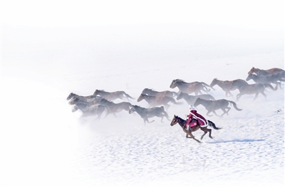 2020年12月31日,贺娇龙在昭苏县天马旅游文化园策马雪原。新华社记者 白志强摄