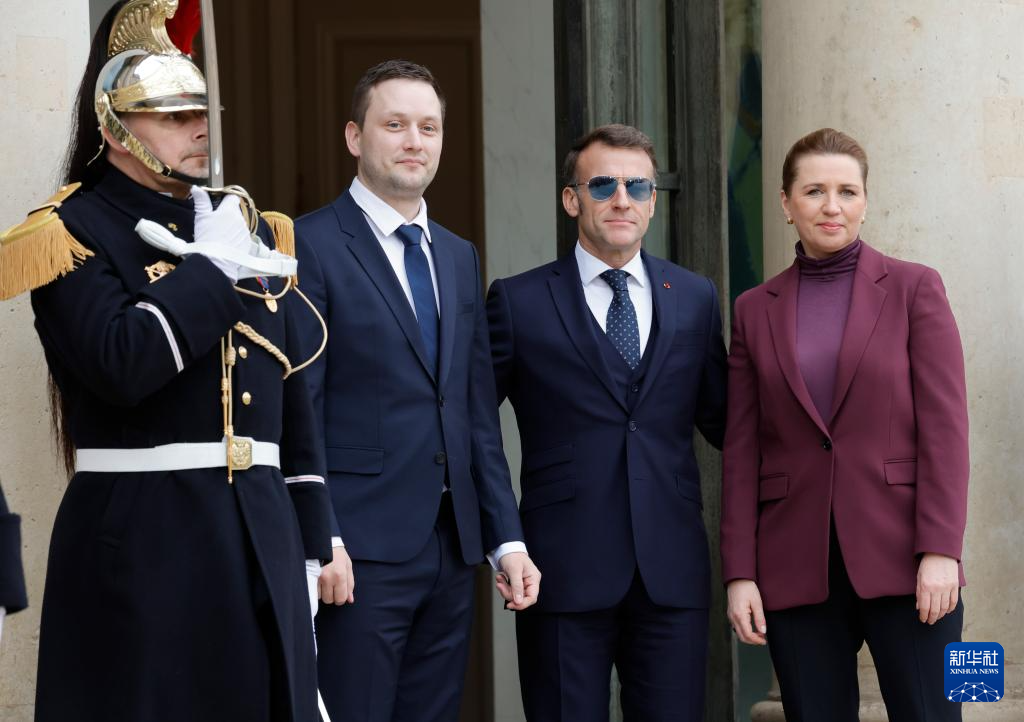 1月28日,法国总统马克龙(左)在巴黎欢迎到访的丹麦首相弗雷泽里克森。新华社发(亨利·施瓦茨摄)