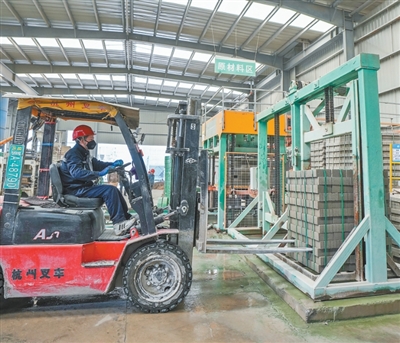湖北武汉市盛璟阳环保材料有限公司内,工人搬运用建筑垃圾制成的标砖。黄士峰摄
