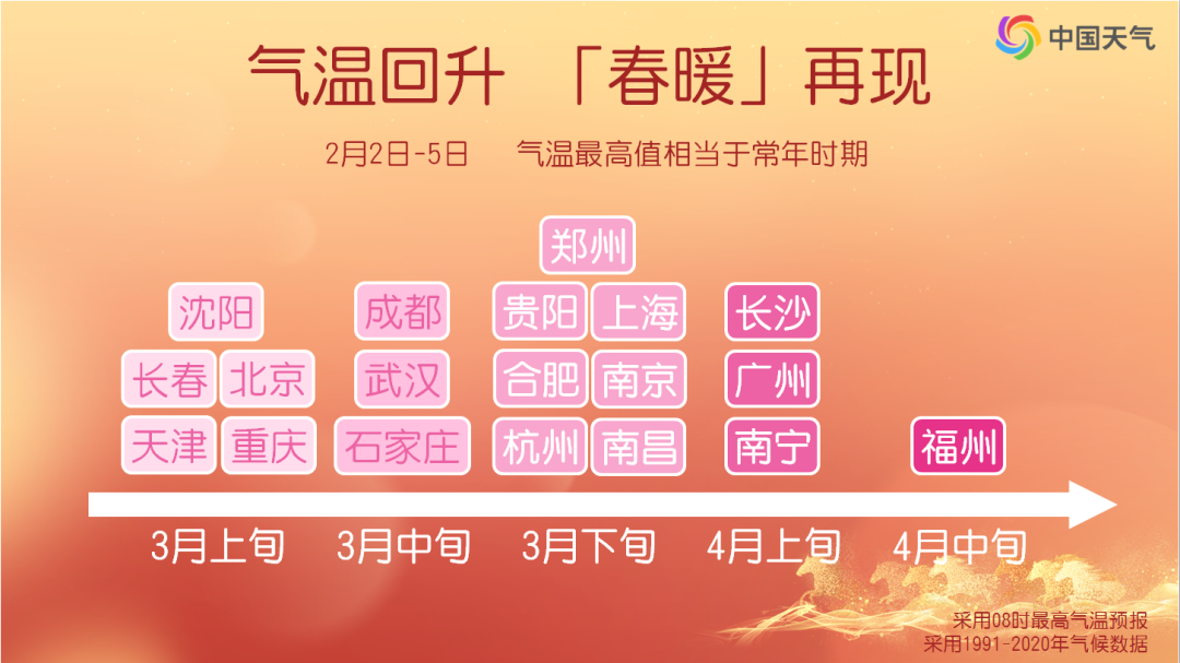 明后天,回暖势头将持续,而且暖意会越来越明显,我国大部地区会在较同期偏暖的情况下进入立春节气,部分地区可能度过2026年来最暖和的一天,南方不少地方会在立春当天(2月4日)有常年春分前后的体感。